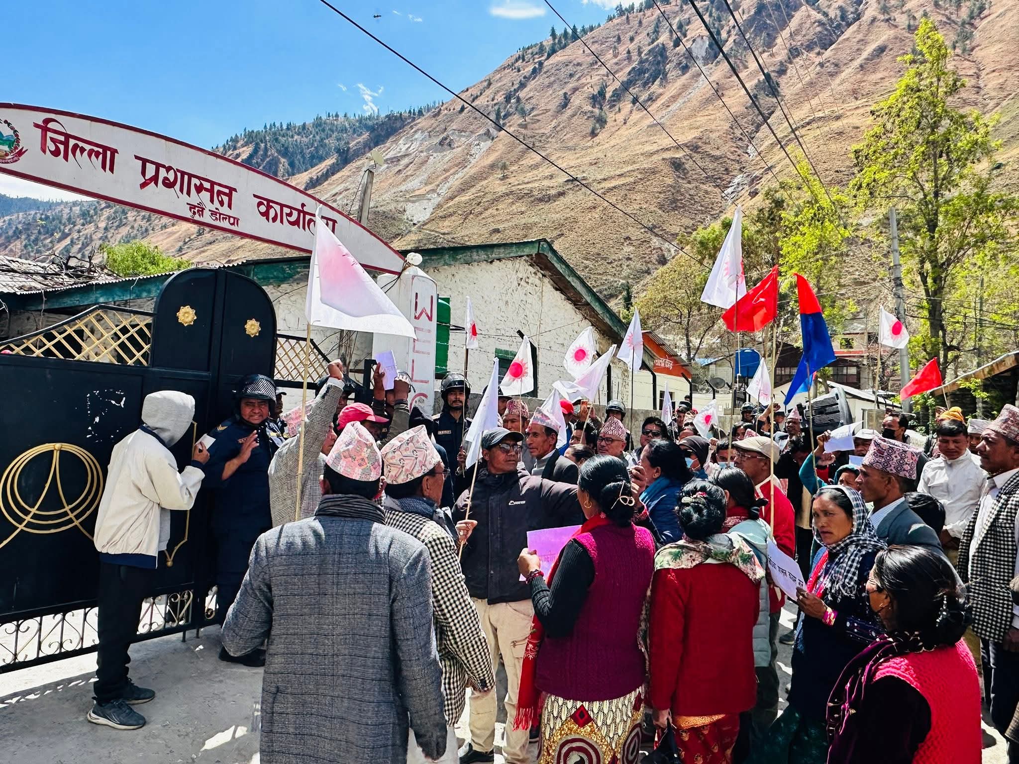 नेकपा एमाले जिल्ला कार्यसमिति डोल्पाले तत्काल सरकारको नियन्त्रणमा रहेका अध्यक्ष ओलीलाई रिहा गर्न माग गर्दै प्रदर्शनकारीहरूले जिल्ला प्रशासन कार्यालयको मूल गेटमा समेत नाराबाजी गरेका थिए ।