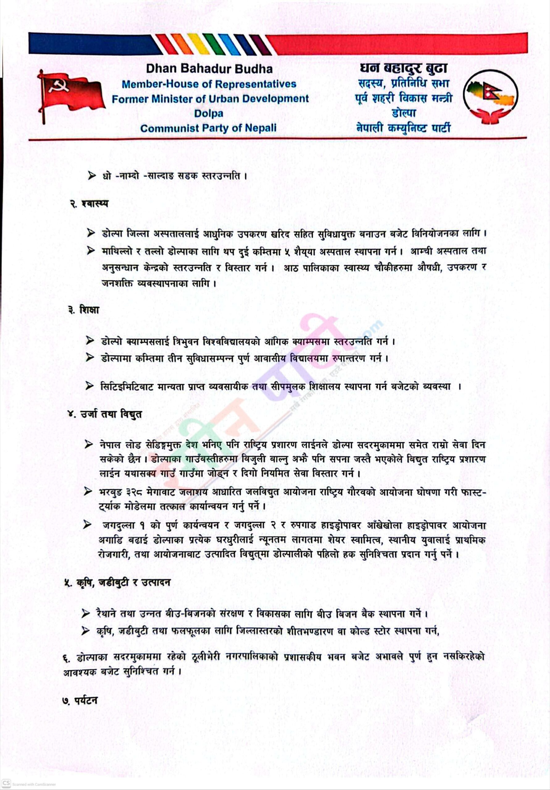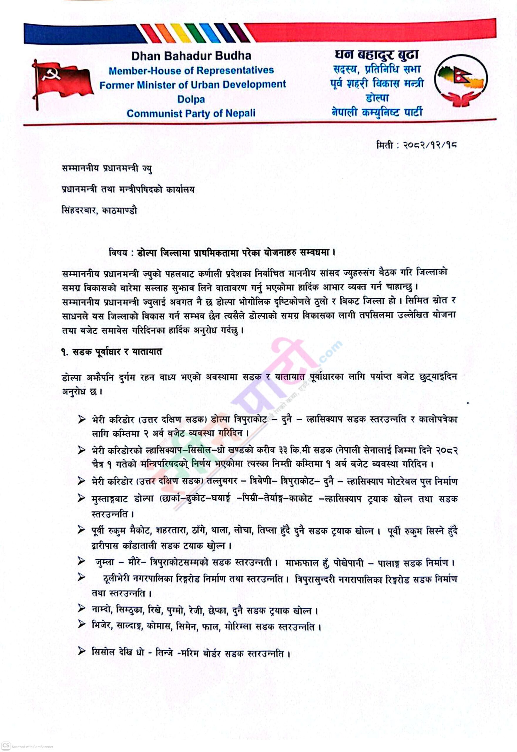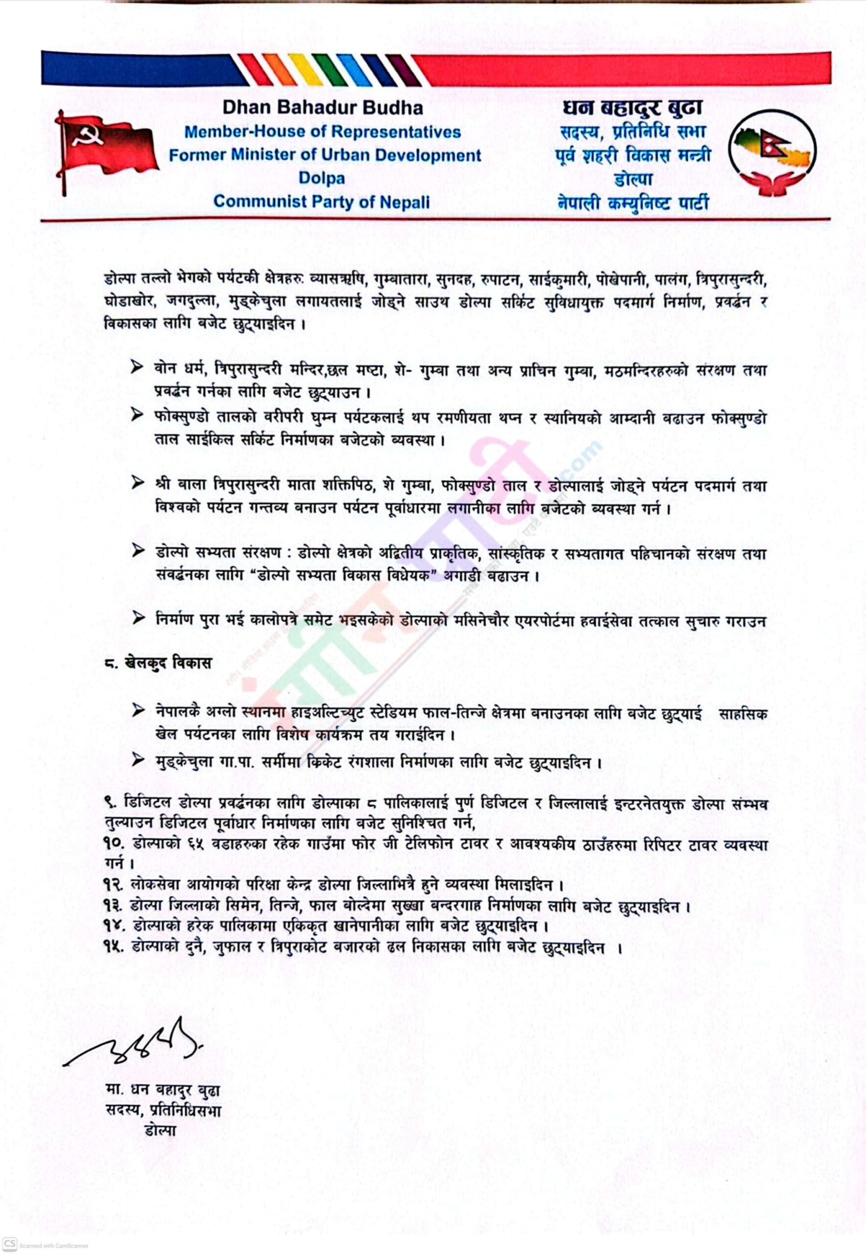 सांसद बुढाले डोल्पाको दिगो र समावेशी विकासका लागि यी सबै योजनालाई समेटेर आगामी बजेटमा प्राथमिकताका साथ समावेश गर्न प्रधानमन्त्रीसँग आग्रह समेत गरेका छन्।