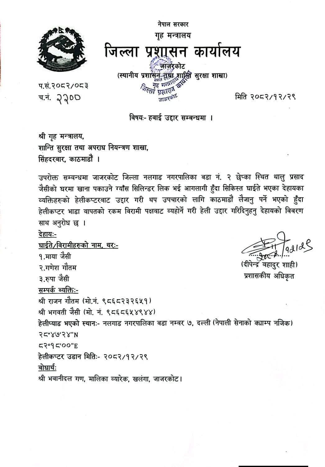 उनको पोस्ट पछि लगत्तै भर्खरै मात्र जाजरकोट देखि निर्वाचित प्रतिनिधि सभा सदस्य खडक बहादुर बूढाको पहलमा उद्धार भयो भन्दै उनका कार्यकर्ताले लेखी हाले । उद्धारमा उनी पुगेको फोटो समेत सार्वजनिक भए । खासमा सांसद बूढा घटना हुँदा सुर्खेत थिए , नेपाली सेनाको हेलिकप्टर उद्धारको लागि जाँदै छ भन्ने थाहा पाएपछि घटनास्थलमा जानको लागि उनी सुर्खेत विमानस्थल पुगे। उनी पुग्नु अघिनै हेलीकप्टर जाजरकाेट जान तयारी अवस्थामा थियो ।