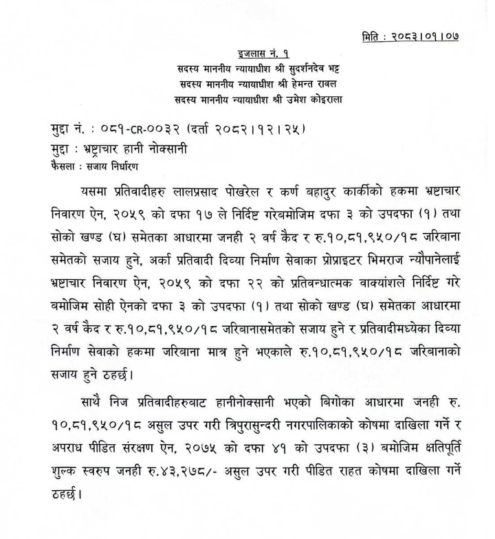 अदालतका अनुसार तत्कालीन निमित्त प्रमुख प्रशासकीय अधिकृत लालप्रसाद पोखरेल र इन्जिनियर कर्णबहादुर कार्कीलाई जनही २ वर्ष कैद र १० लाख ८१ हजार ९५० रुपैयाँ १८ पैसा जरिवाना हुने ठहर गरिएको छ। साथै, सडक निर्माणको जिम्मा पाएको दिव्या निर्माण सेवा प्रालिका प्रोप्राइटर भीमराज न्यौपानेलाई पनि समान सजाय तोकिएको छ।